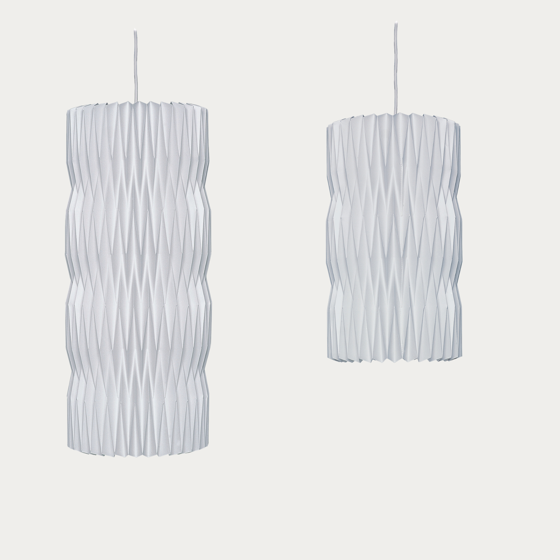 Der dannes tre tydelige dekorative bånd på skærmen, hvor krydsplisseringerne mødes. Model 102 kan anvendes som pendel og som lampeskærm til gulvlamperne Model 397 + 398.