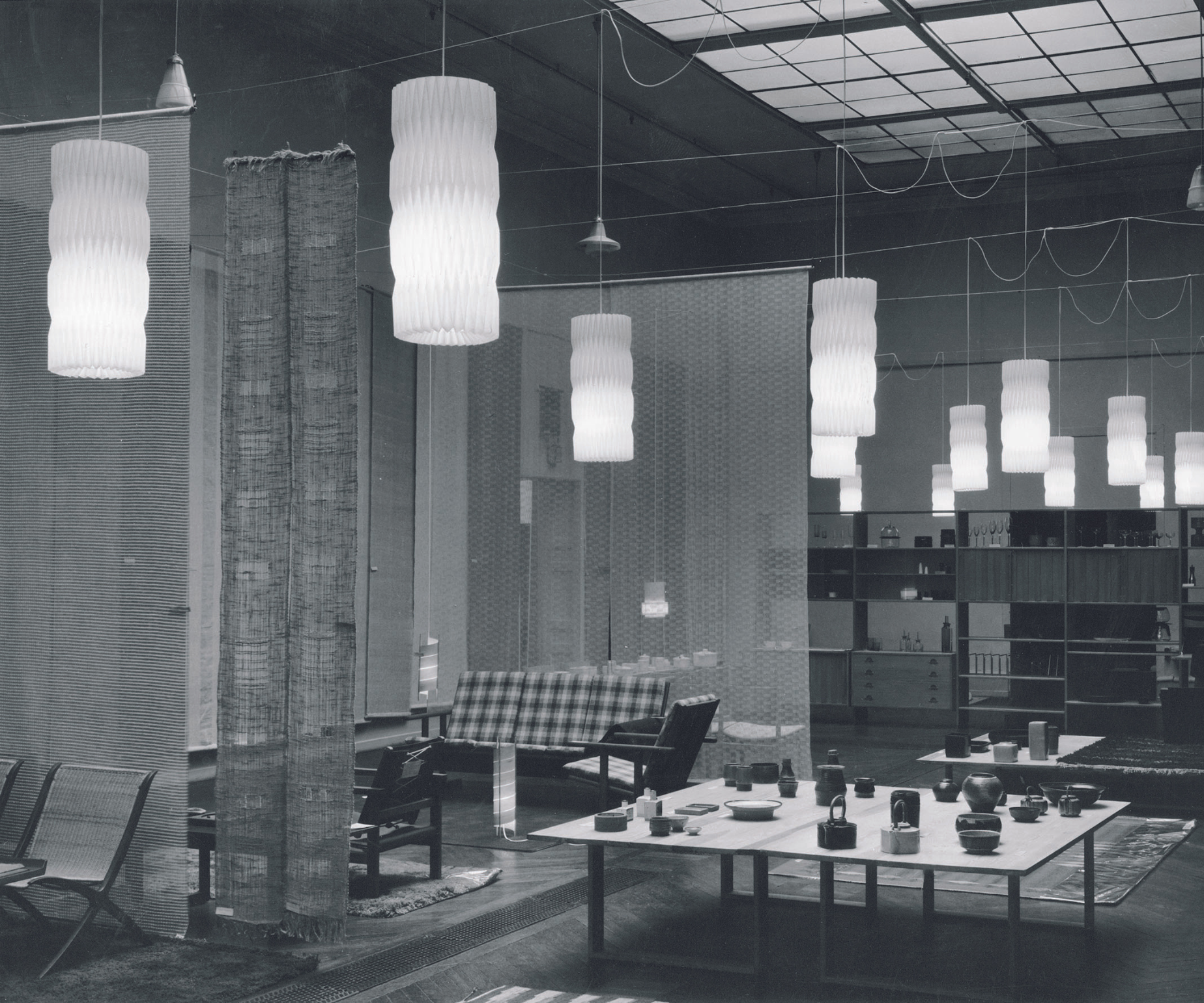 Med inspiration fra Kaare Klints krydsplisseringsteknik i Frugtlygten, designede Tove & Edvard Kindt-Larsen i 1954 denne cylinderformede skærm.