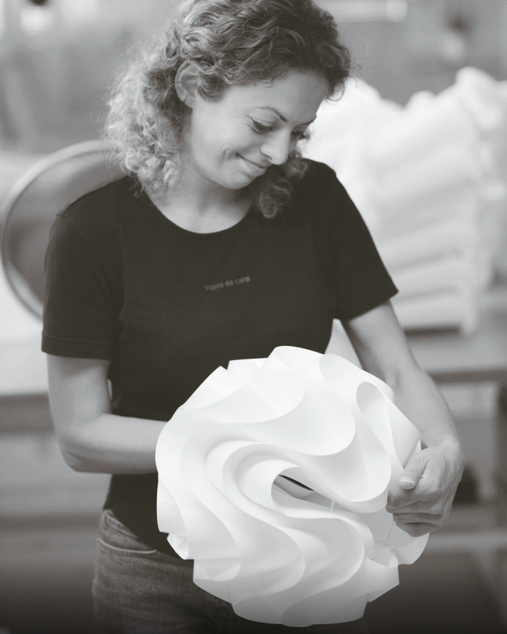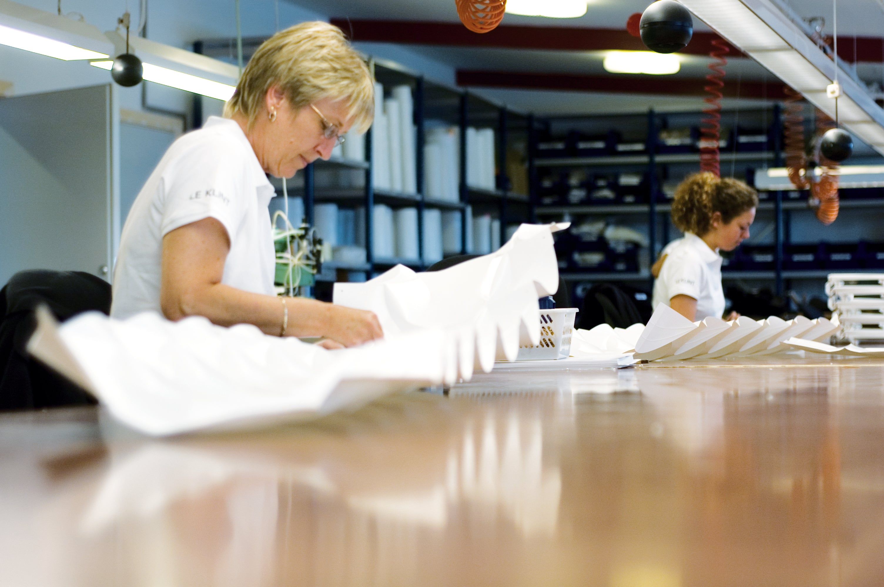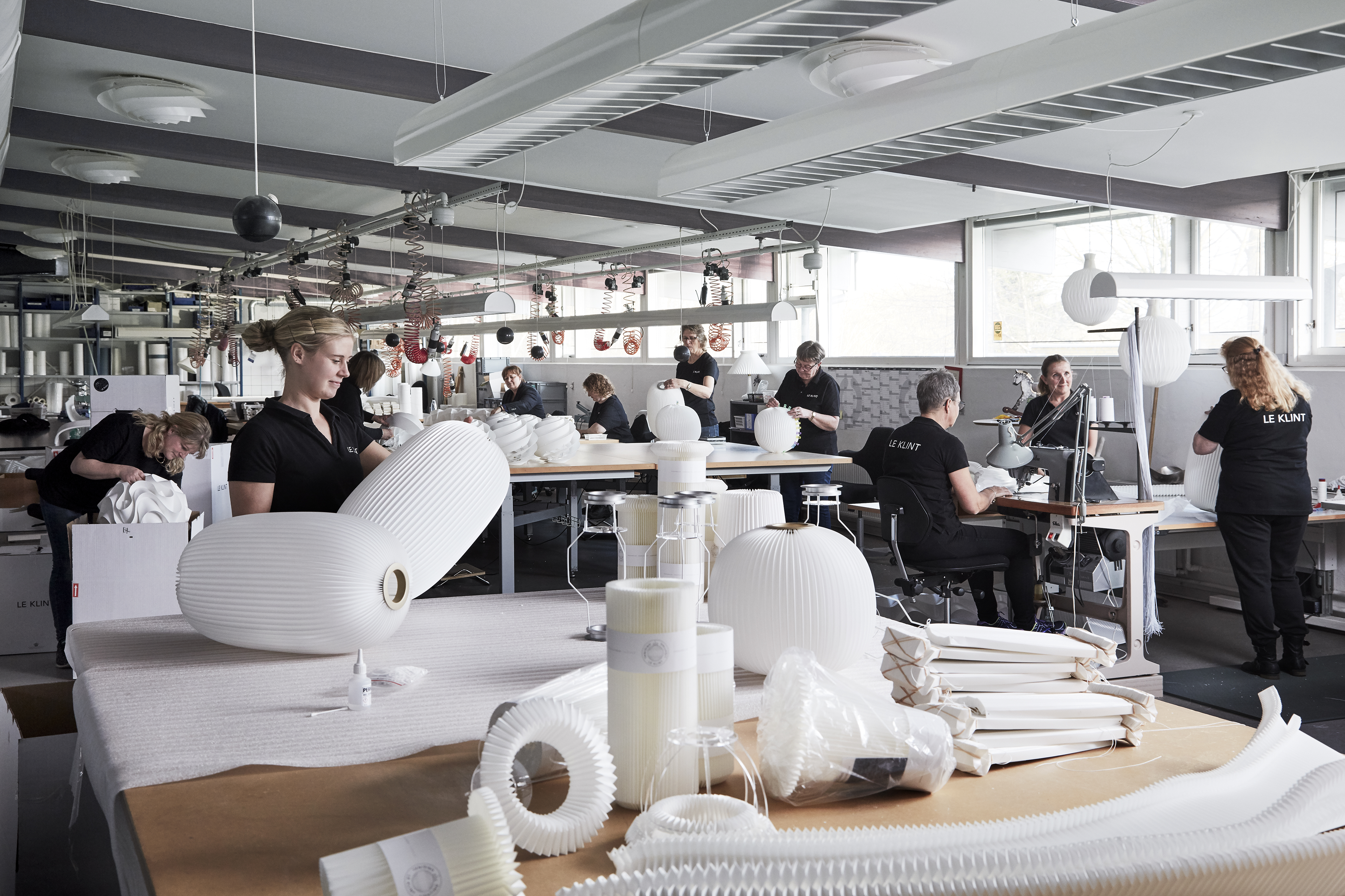 Le Klints foldemedarbejdere, som de kaldes, er noget helt særligt. Ingen andre steder end i Odense har man bevaret det at folde lampeskærme som et håndværk. Men det er også kun hos Le Klint, at man fremstiller krydsplisserede skærme. Foldehåndværket er samtidig et synonym med den lange tradition for dansk design produceret i Danmark. Med en Le Klint-lampe får man autenticitet, originalitet og den særlige fortælling, der er en del af virksomheden. Mange ingeniører har forsøgt sig med at lave maskiner, der kan kunsten at folde krydsplisseringer, men det har vist sig særdeles vanskeligt og har endnu ikke slået håndværket af banen.