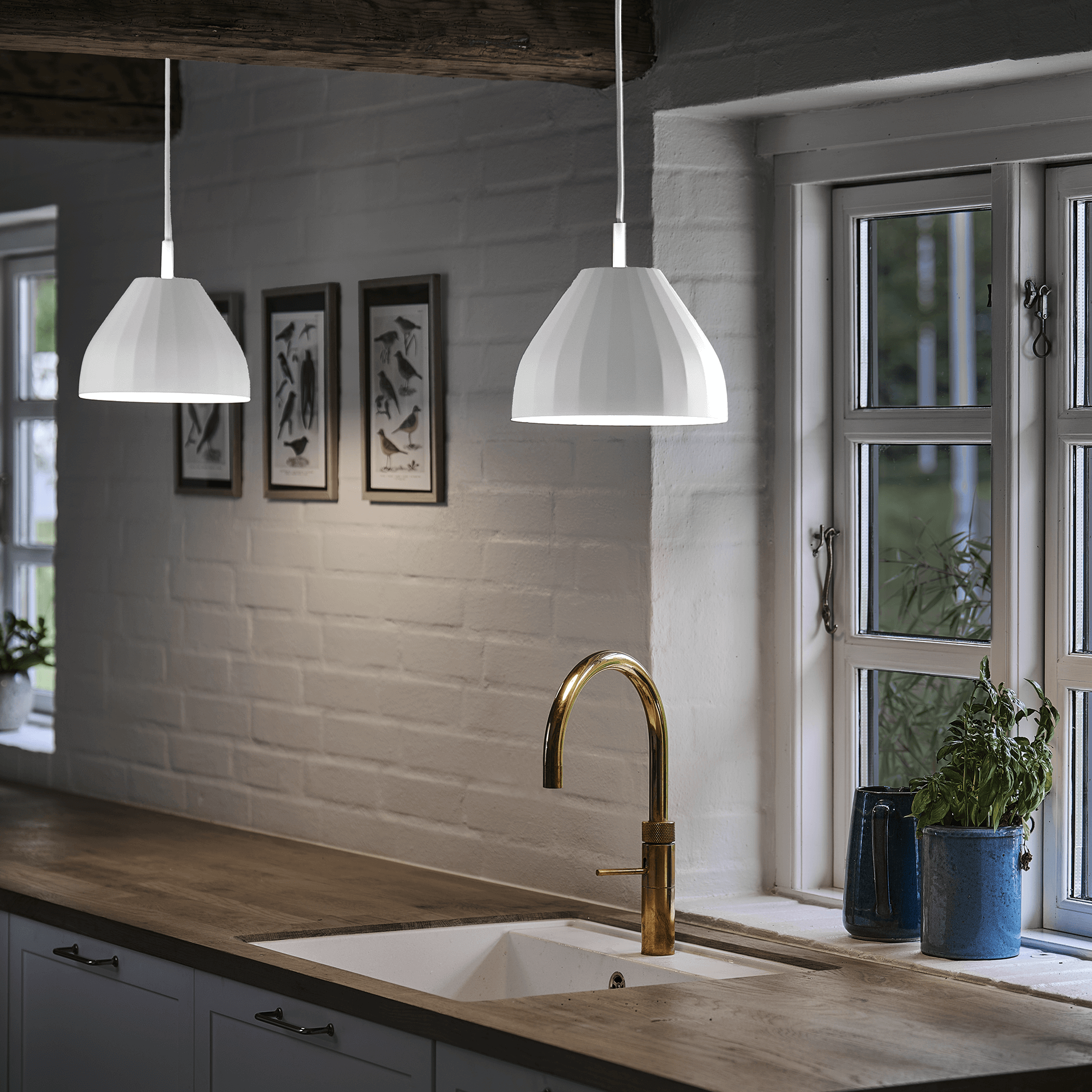 Lampen har en konisk form, hvor lyset rettes i to forskellige retninger – opad og nedad.