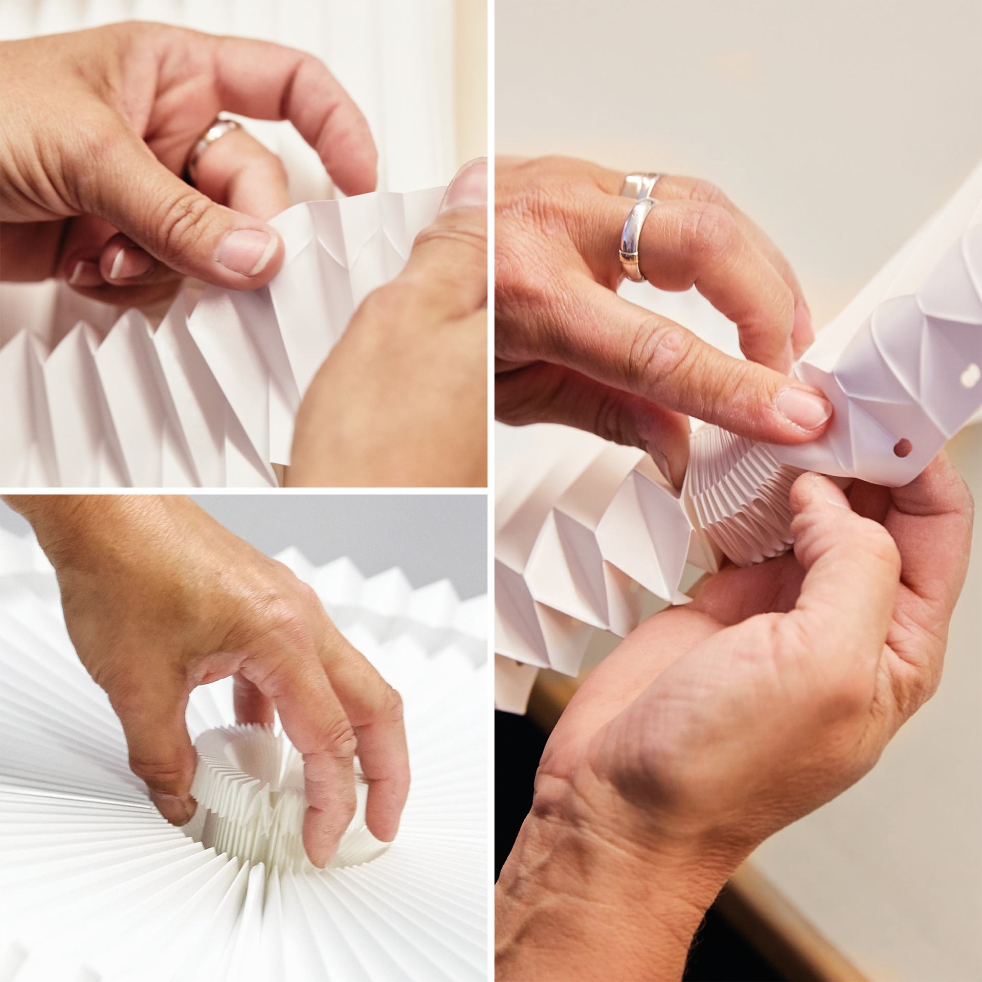 • Hænder der vender en håndfoldet plisseret lampeskærm på et bord