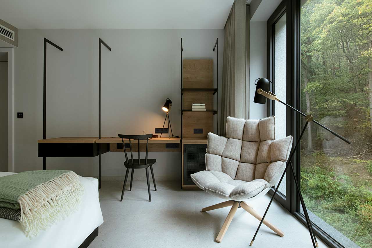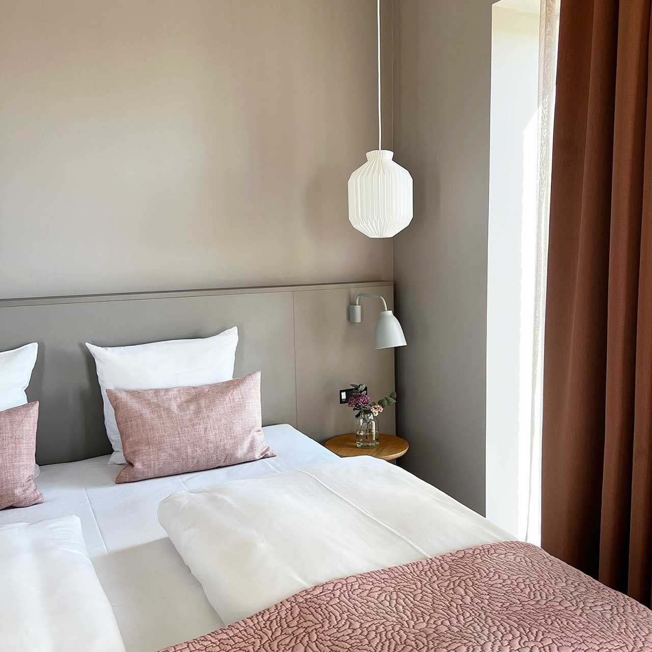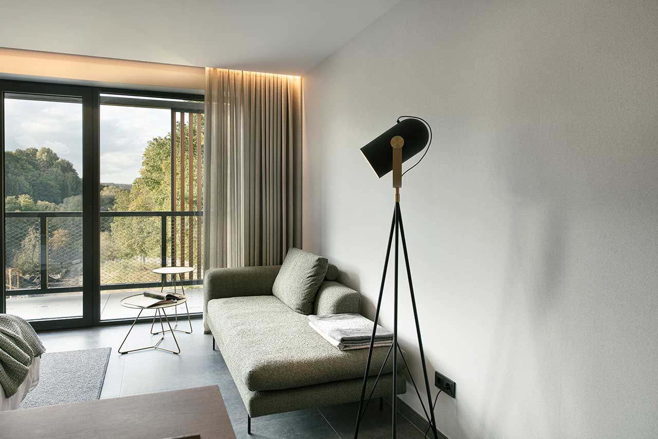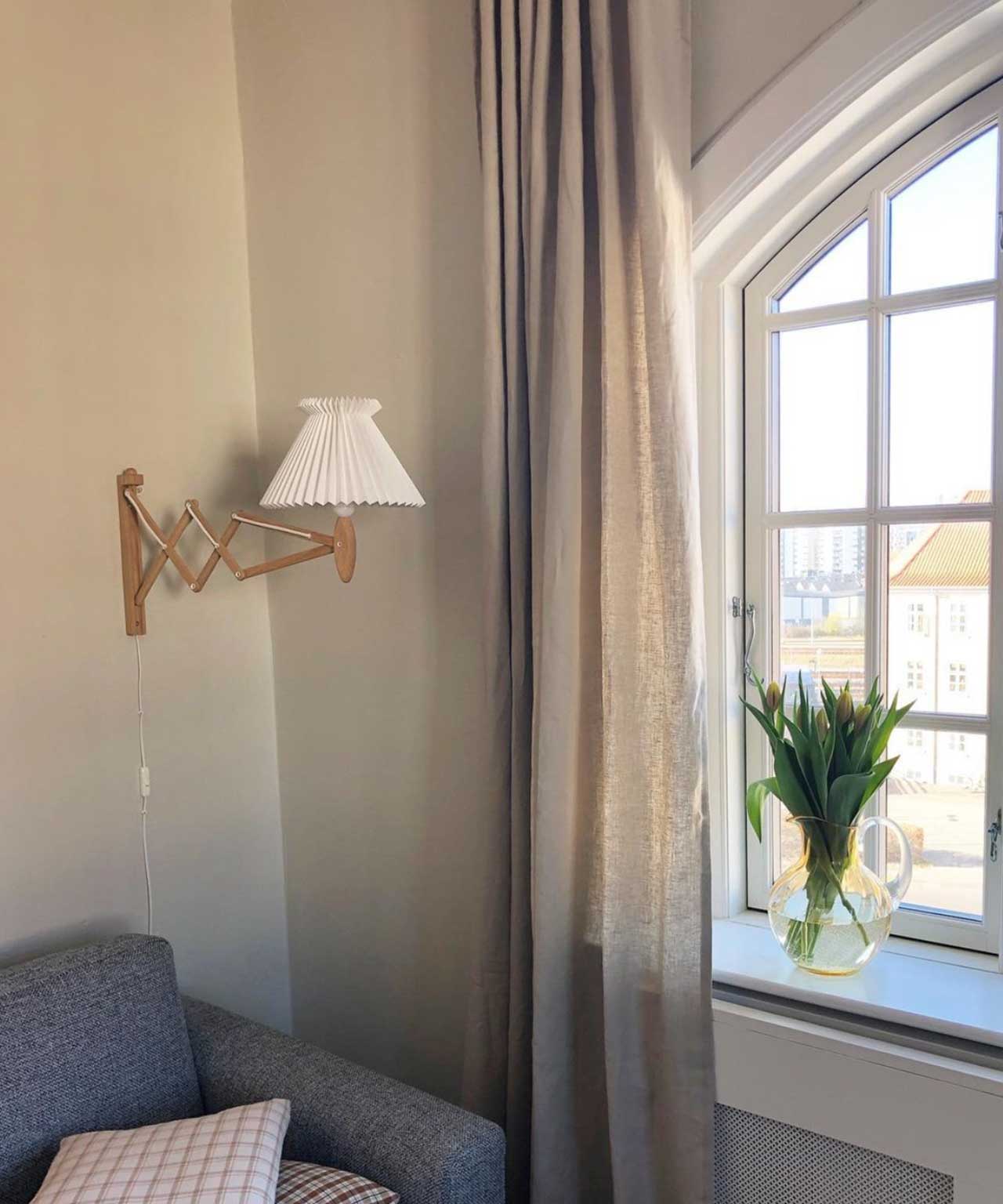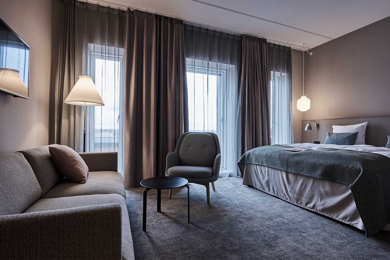 • hotelværelse med gulvlampe fra Le Klint på hotel Odeon i Odense